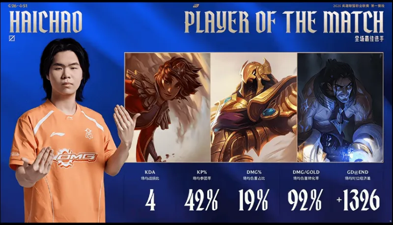 虎扑01月23日讯 Haichao使用岩雀、沙皇、塞拉斯发挥优异,斩获OMG对阵LGD系列赛POM