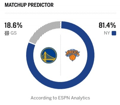 ESPN今日给出本场比赛的胜率预测,勇士只有18.6%,尼克斯81.4%占压倒性优势。